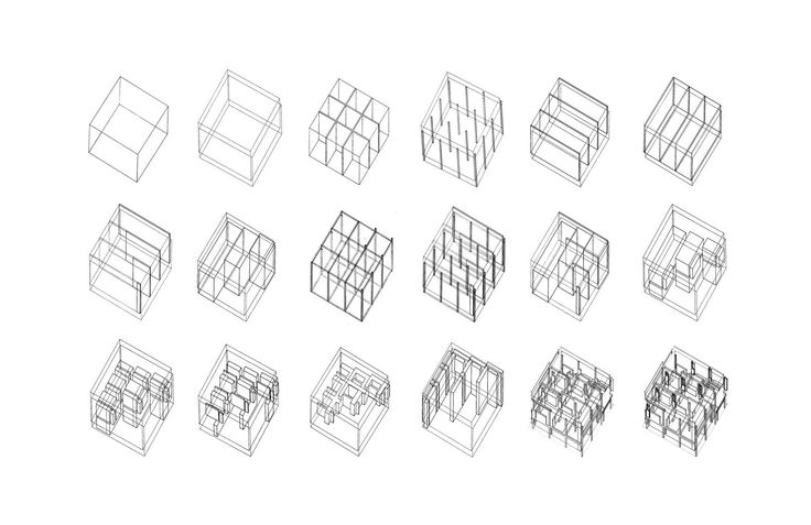 Or why is the wall beside the entrance door angled at 45 degrees?Or why did he incorporate a vestibule in front of the entrance?There is no straight forward answer Carlo could give: "I did this because of that reason ."Carlo Scarpa considered even the smallest details in his projects, such as designing water stream channels to flow from one part of the site to another.There are many other examples, like the architectural works of Peter Eisenman in the Vermont House project.Peter Eisenman utilized cubic sketches to gradually develop the structural divisions and interior spaces of the Vermont House project. Through numerous iterations of these cubic forms, he ultimately achieved detailed clarity, establishing a solid foundation for the project's execution.Just as in Figure 3,